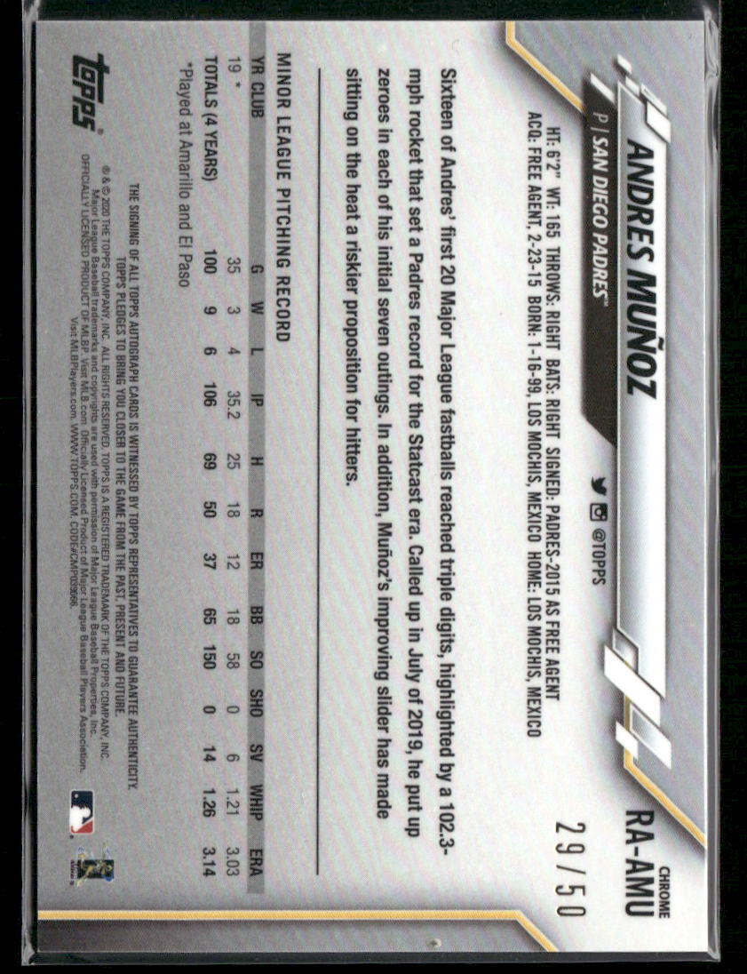 2020 Topps Chrome #RA-AMU Andres Muñoz Rookie Autographs Gold Refractor