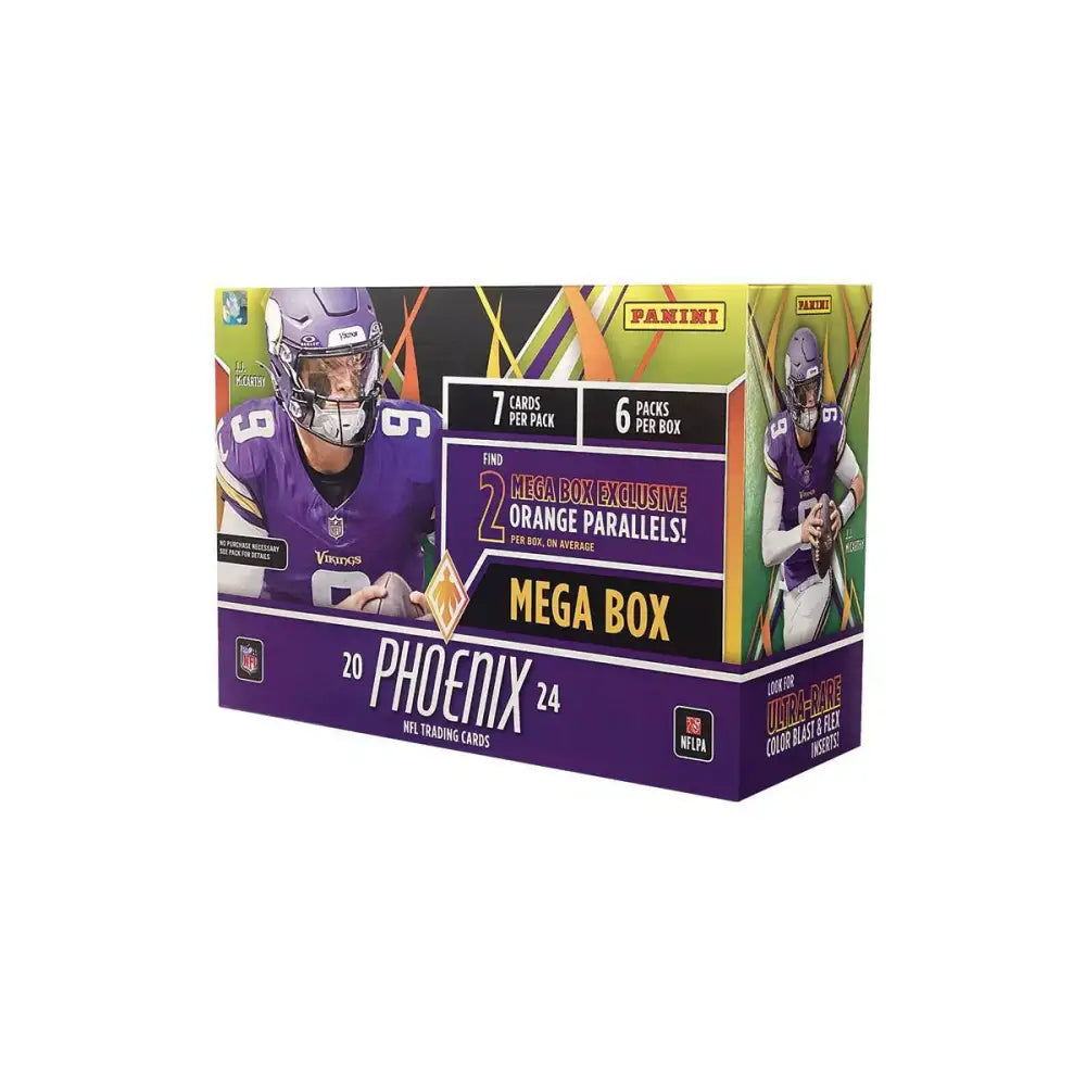 Panini presents the 2024 NFL Phoenix Football Trading Card Mega Box. Each box contains 6 packs with 7 cards per pack. Look for Mega Box Exclusive Orange Parallels! Look for Ultra-Rare Color Blast and Flex Inserts.Look for Autographs from the NFL's Hottest Players! Collect them all. Content may vary.