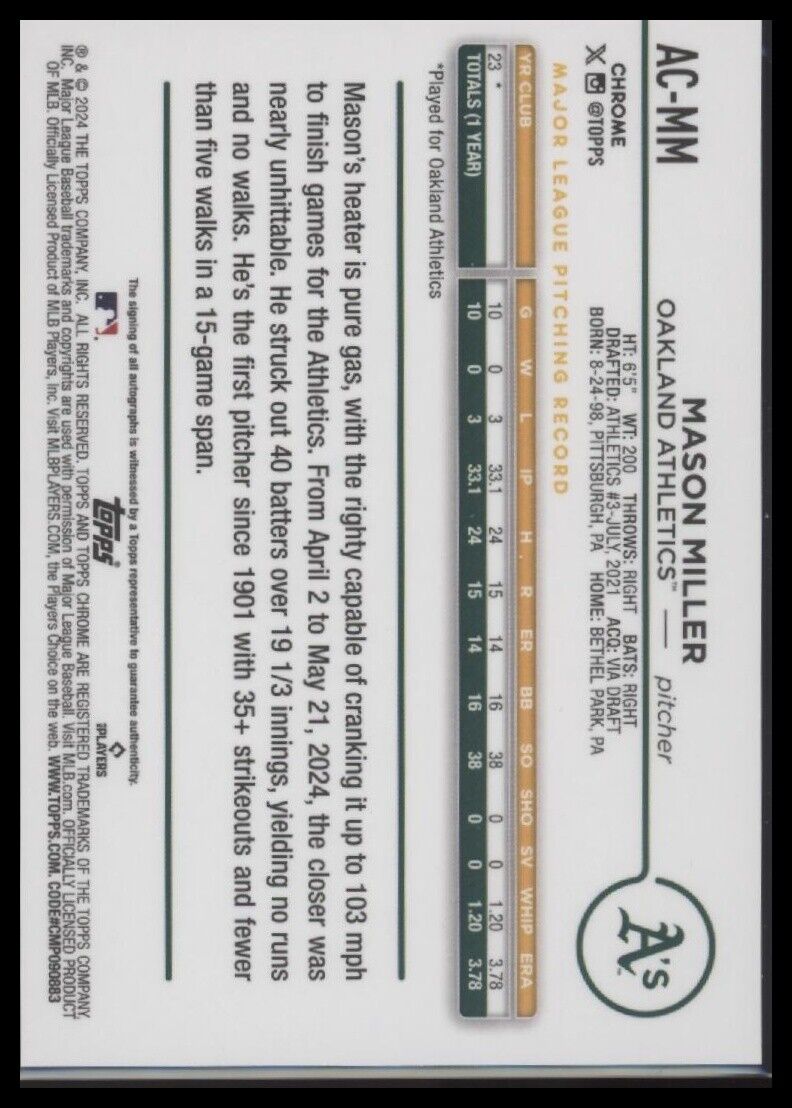 2024 Topps Chrome Update #AC-MM Mason Miller Autographs Purple Speckle Refractors